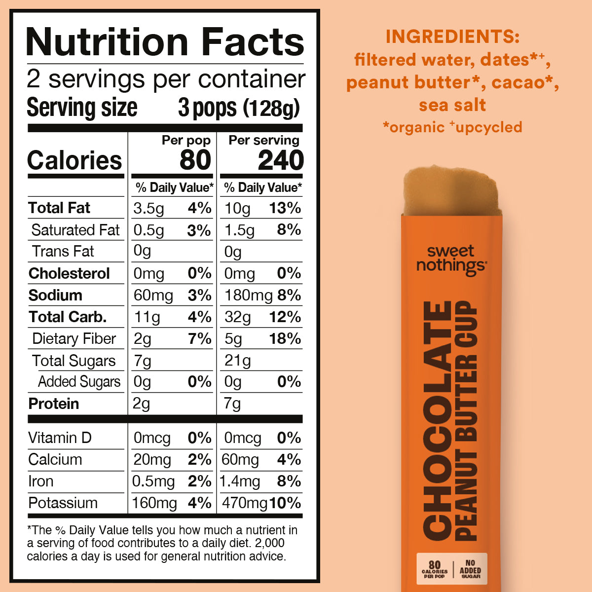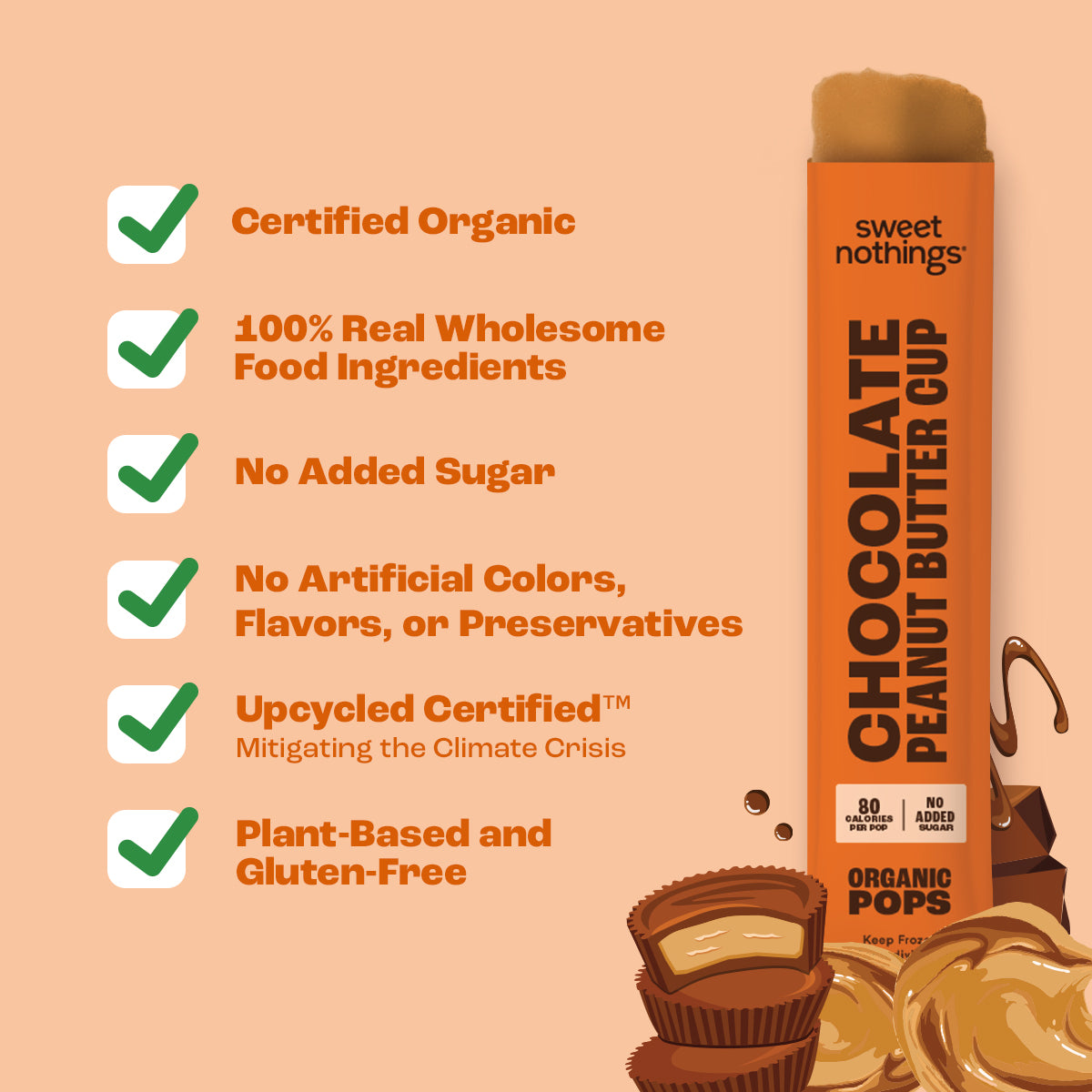 Our Chocolate Peanut Butter Cup Dessert Pops flavor is a delicious combination of organic, real ingredients! These Dessert Pops come in six pre-blended 1.5 oz. tubes of all-natural nutrition with zero added sugar. They are naturally sweet and perfectly portable.