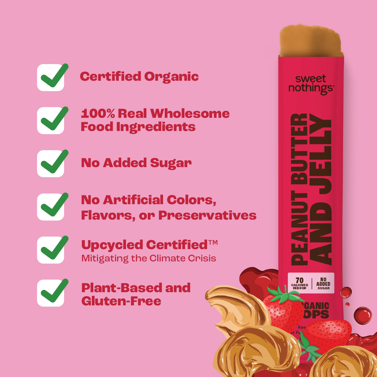 Our Peanut Butter and Jelly Dessert Pops flavor is a delicious combination of organic, real ingredients! These Dessert Pops come in six pre-blended 1.5 oz. tubes of all-natural nutrition with zero added sugar. They are naturally sweet and perfectly portable.